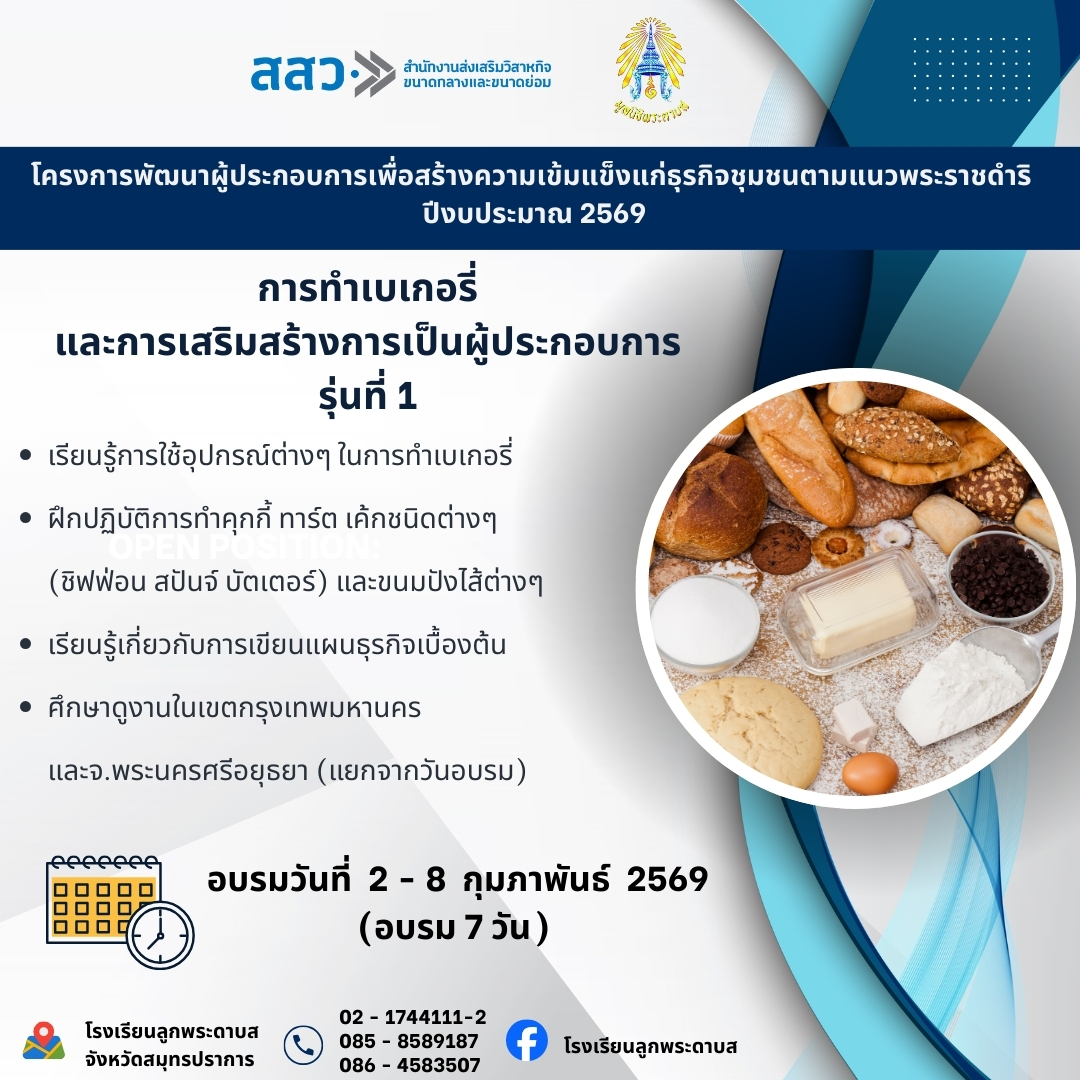 โครงการพัฒนาผู้ประกอบการเพื่อสร้างความเข้มแข็งแก่ธุรกิจชุมชนตามแนวพระราชดำริ ปีงบประมาณ 2569 (การทำเบเกอรี รุ่น 1)