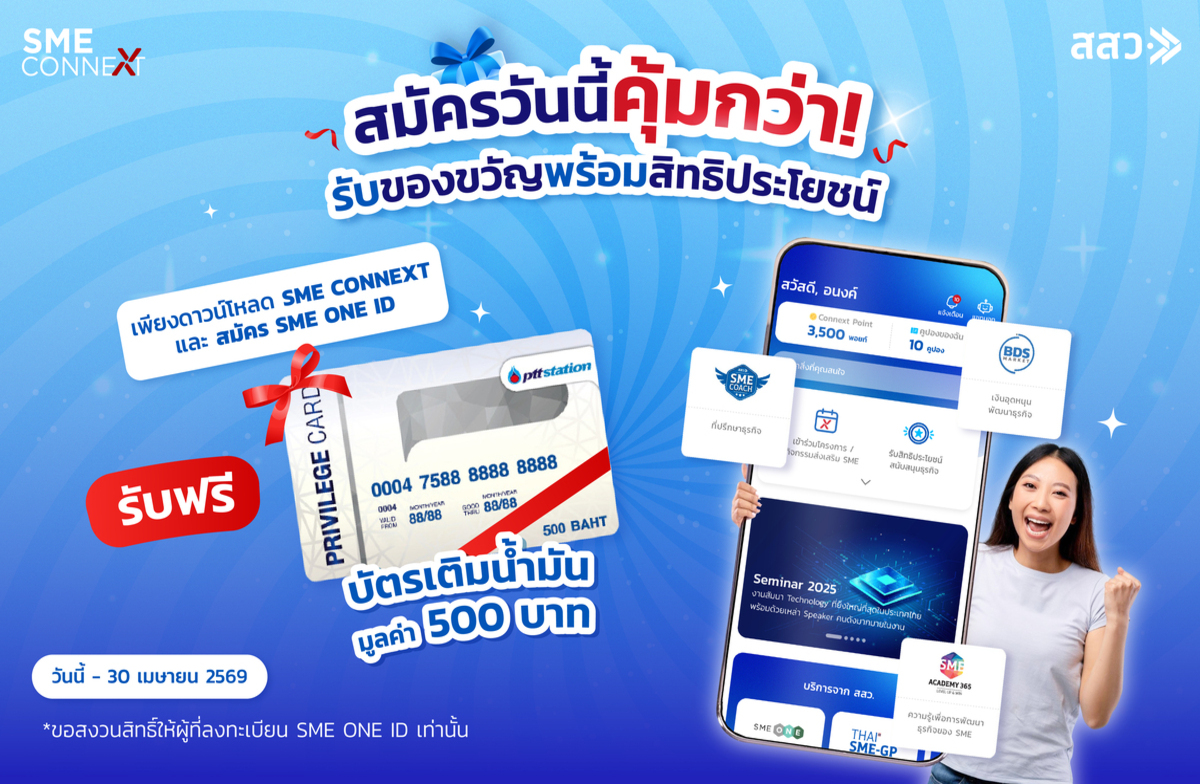 🎁ยืนหนึ่งเรื่องสิทธิประโยชน์เพื่อผู้ประกอบการ เพียงลงทะเบียน SME ONE ID และเข้าใช้งาน SME CONNEXT 🎉รับเลย บัตรเติมน้ำมัน มูลค่า 500 บาท ตั้งแต่วันนี้ - 30 เมษายน 2569