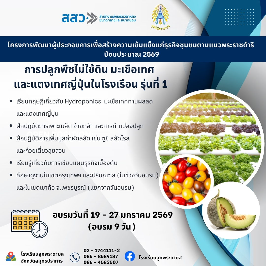 โครงการพัฒนาผู้ประกอบการเพื่อสร้างความเข้มแข็งแก่ธุรกิจชุมชนตามแนวพระราชดำริ ปีงบประมาณ 2569 (การปลูกพืชไม่ใช้ดินฯ รุ่น 1)